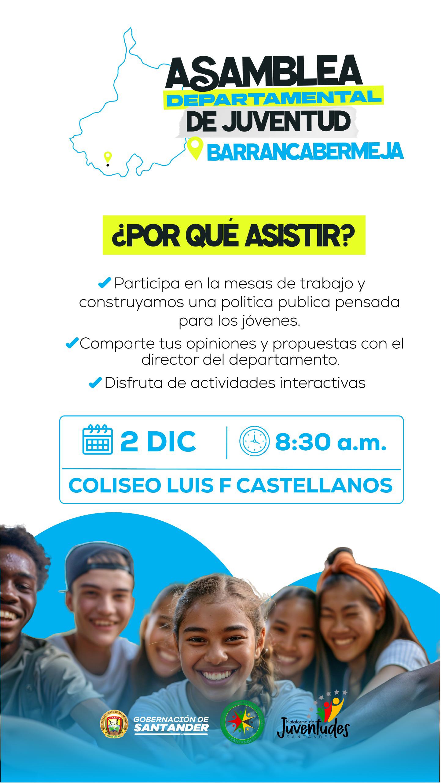 Barrancabermeja recibirá a más de 1.000 jóvenes provenientes de las seis provincias de Santander en el marco de la Segunda Asamblea Departamental de Juventudes. Este evento se desarrollará en el coliseo Luis F. Castellanos, a partir de las 8:30 a.m., en donde se busca fortalecer las políticas públicas destinadas a la juventud en la región.