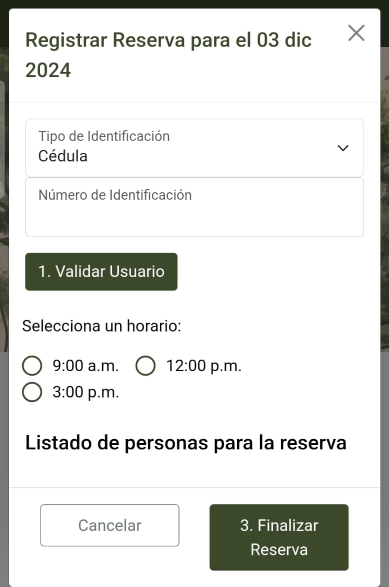 Cada persona podrá registrar hasta cuatro visitantes adicionales, proporcionando datos básicos como nombre completo, documento de identidad y datos de contacto. Una vez completado el registro, se generará un código QR, el cual deberá ser presentado junto con un documento de identidad al momento de acceder al parque.