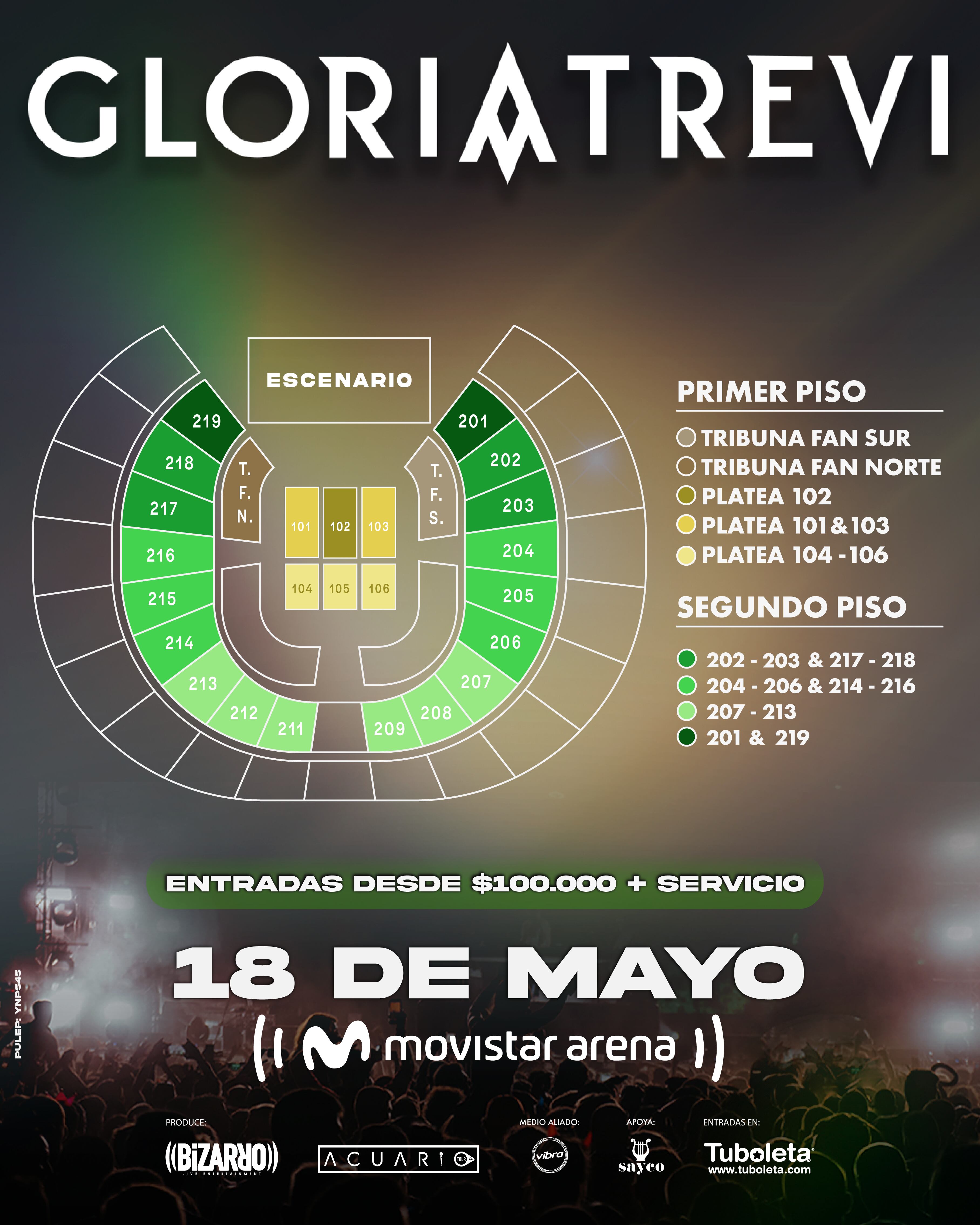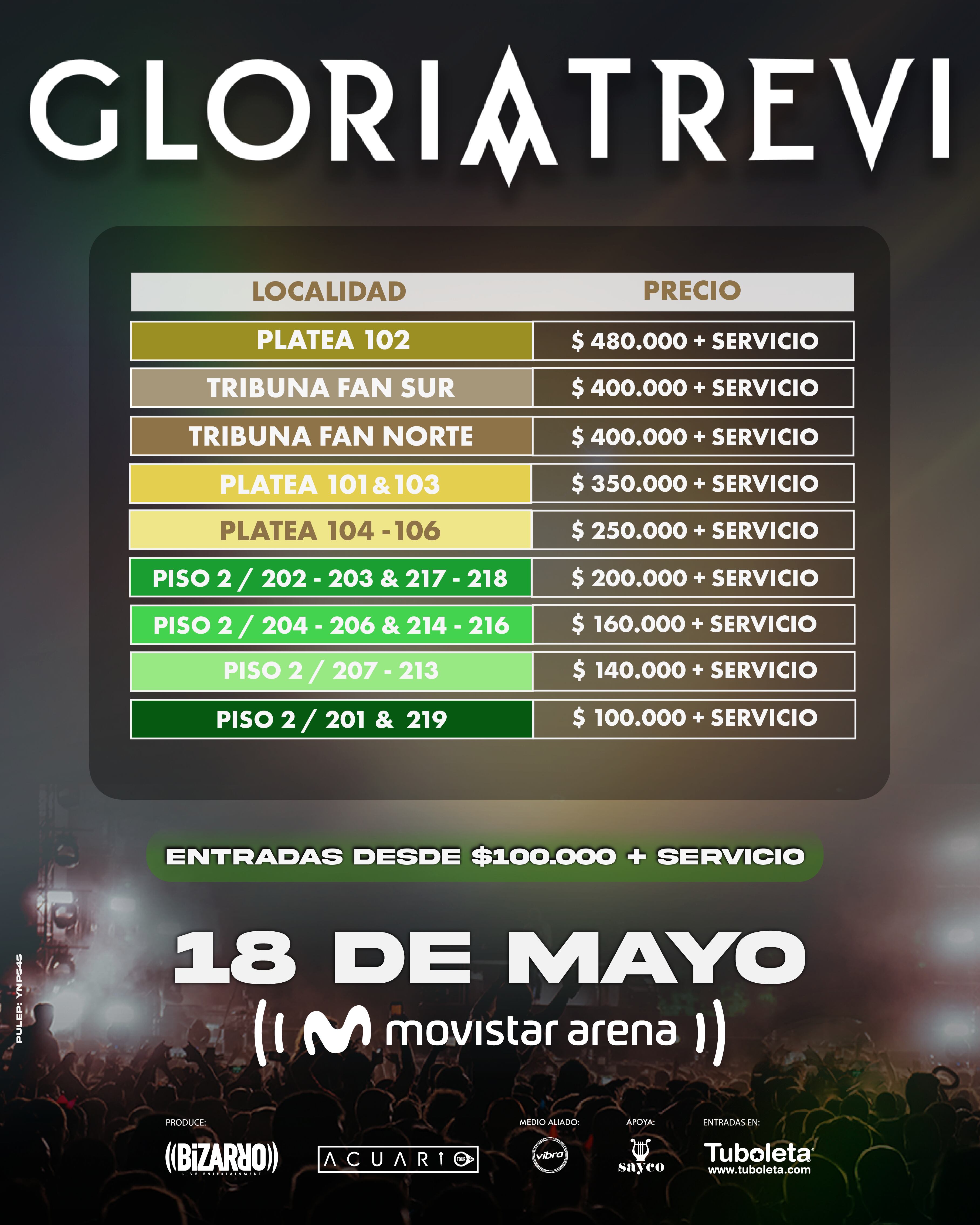 La emblemática cantante, actriz y compositora mexicana, Gloria de los Ángeles Treviño Ruiz, más conocida como la legendaria Gloria Trevi, llegará a la capital del país el próximo 18 de mayo con todo su repertorio; desde sus éxitos musicales de los años 90 que la han posicionado como la famosa artista que es hoy en día con temas como “Todos Me Miran” “Con los Ojos Cerrados” “Esa Hembra es Mala” y muchos más, hasta sus producciones más recientes,“Borracha” junto a María Becerra, “Cueste lo Que Cueste” “Tu Regalo Soy Yo” entre otros.