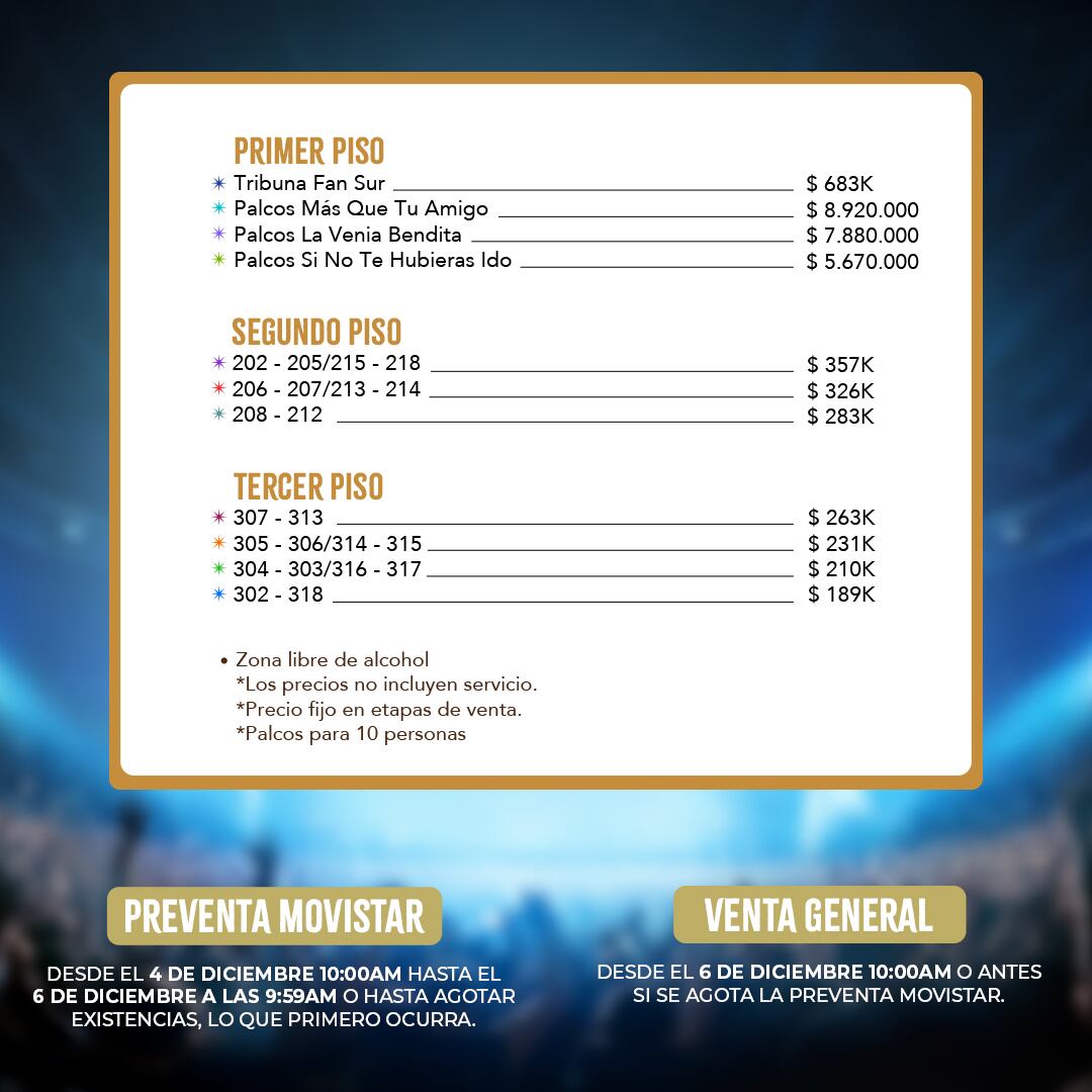 Venta General: Desde el 6 de diciembre a las 10:00 am o antes si finaliza la Preventa Movistar, hasta agotar existencias.