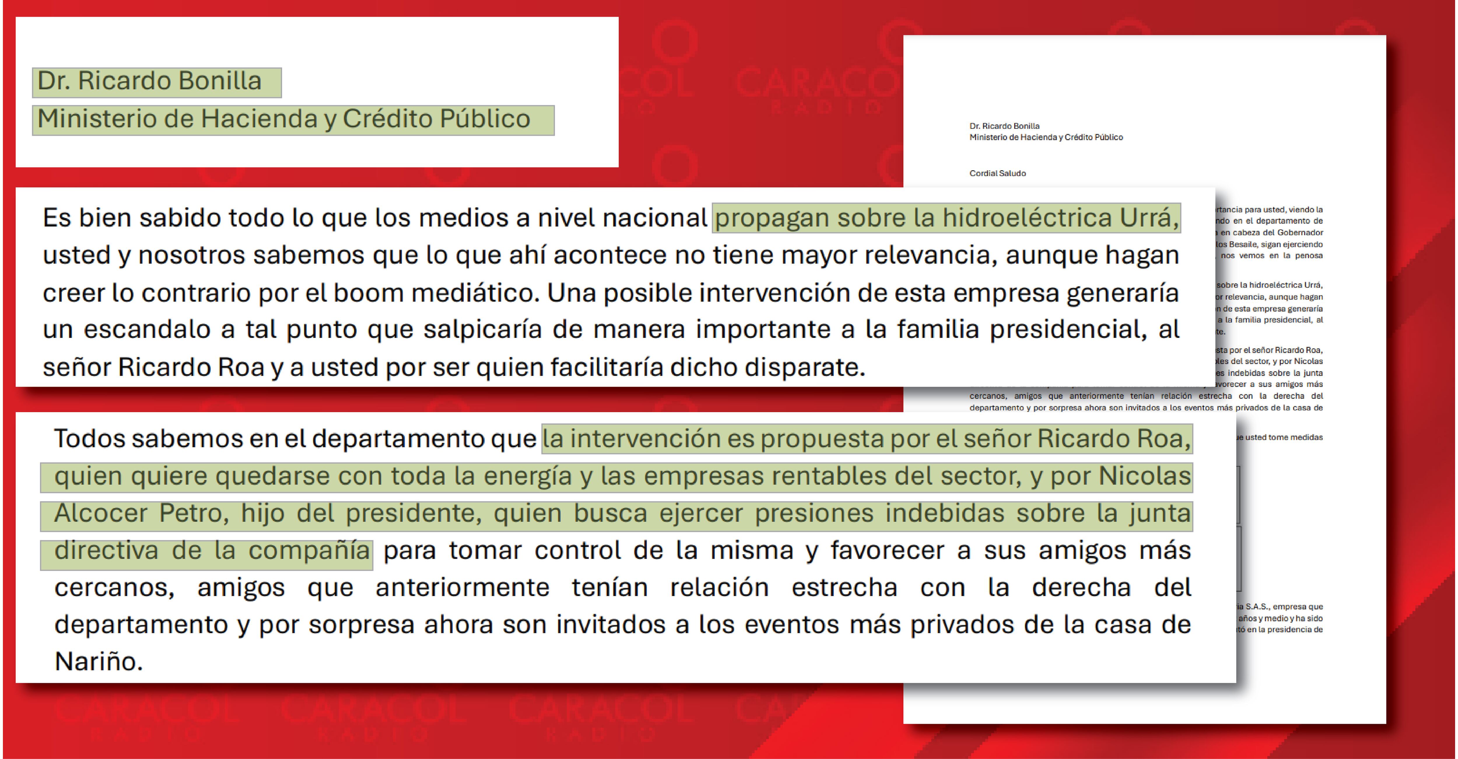 En otro aparte de ese anónimo menciona que “la intervención es propuesta por el señor Ricardo Roa, quien quiere quedarse con toda la energía y las empresas rentables del sector y por Nicolas Alcocer Petro, hijo del presidente, quien busca ejercer presiones indebidas sobre la junta directiva de la compañía para tomar control de la misma y favorecer a sus amigos más cercanos, amigos que anteriormente tenían relación estrecha con la derecha del departamento y por sorpresa ahora son invitados a los eventos más privados de la casa de Nariño”.