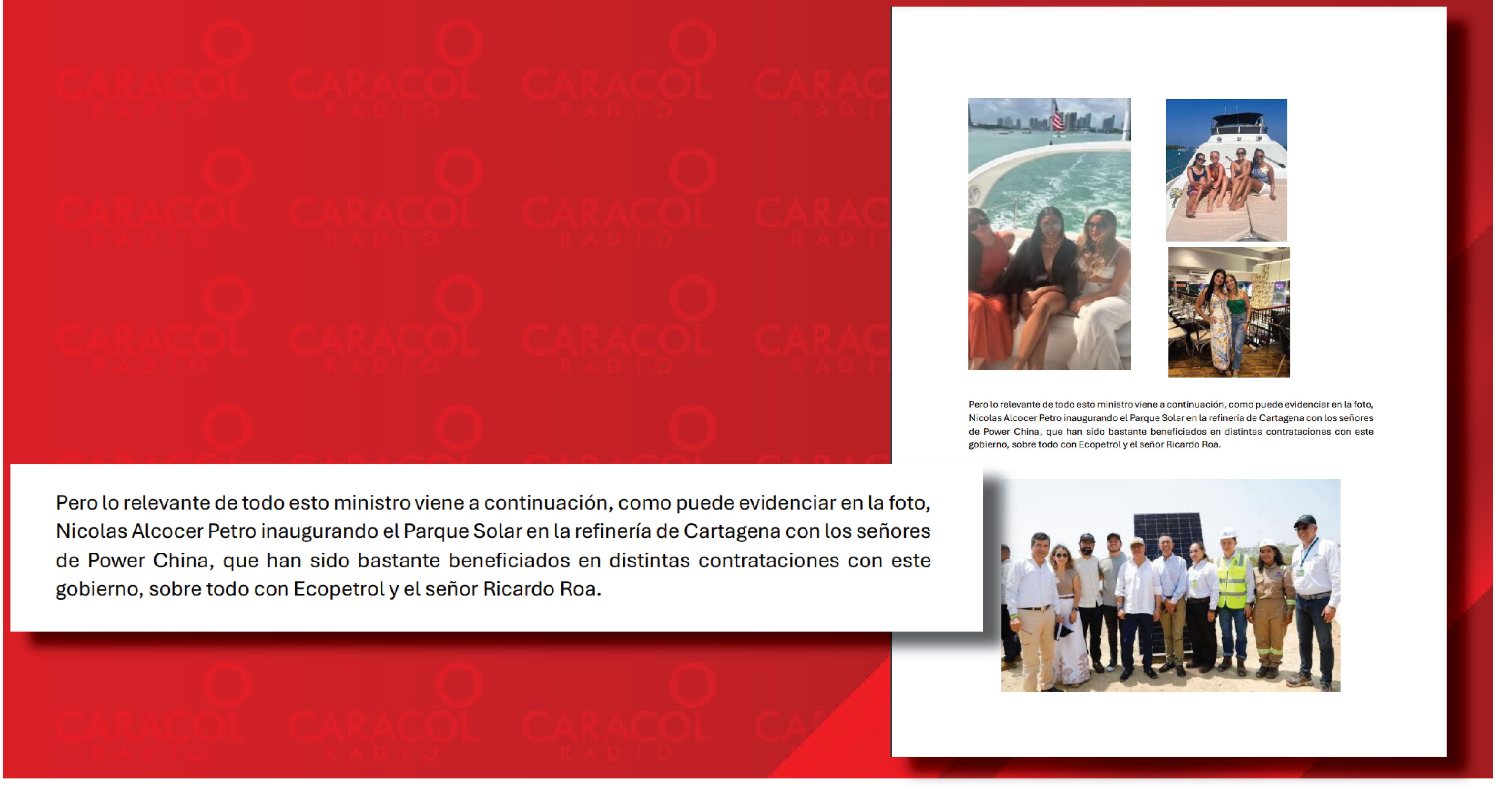 En otro aparte se indica lo siguiente: “Pero lo relevante de todo esto ministro viene a continuación, como puede evidenciar en la foto, Nicolas Alcocer Petro inaugurando el Parque Solar en la refinería de Cartagena con los señores de Power China, que han sido bastante beneficiados en distintas contrataciones con este gobierno, sobre todo con Ecopetrol y el señor Ricardo Roa” ((ver foto))