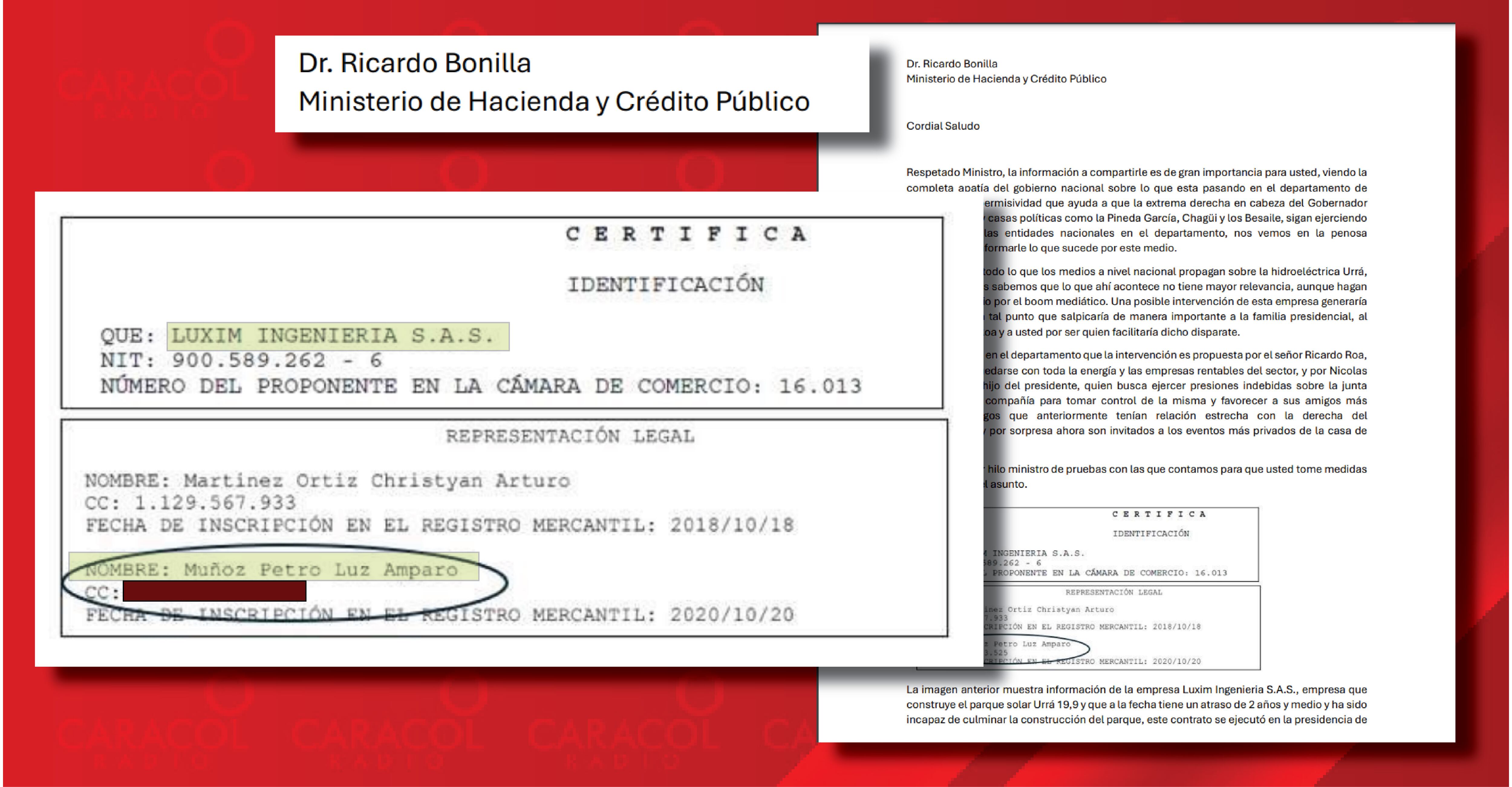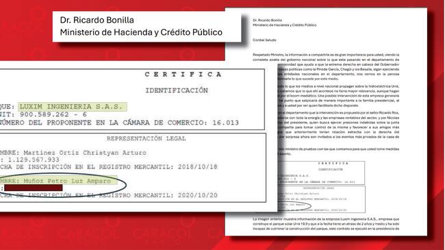 “Esta empresa cuenta con representación legal de Luz Amparo Muñoz Petro, familiar del presidente y muy cercana al señor Nicolas Alcocer Petro”, se lee en el manuscrito.