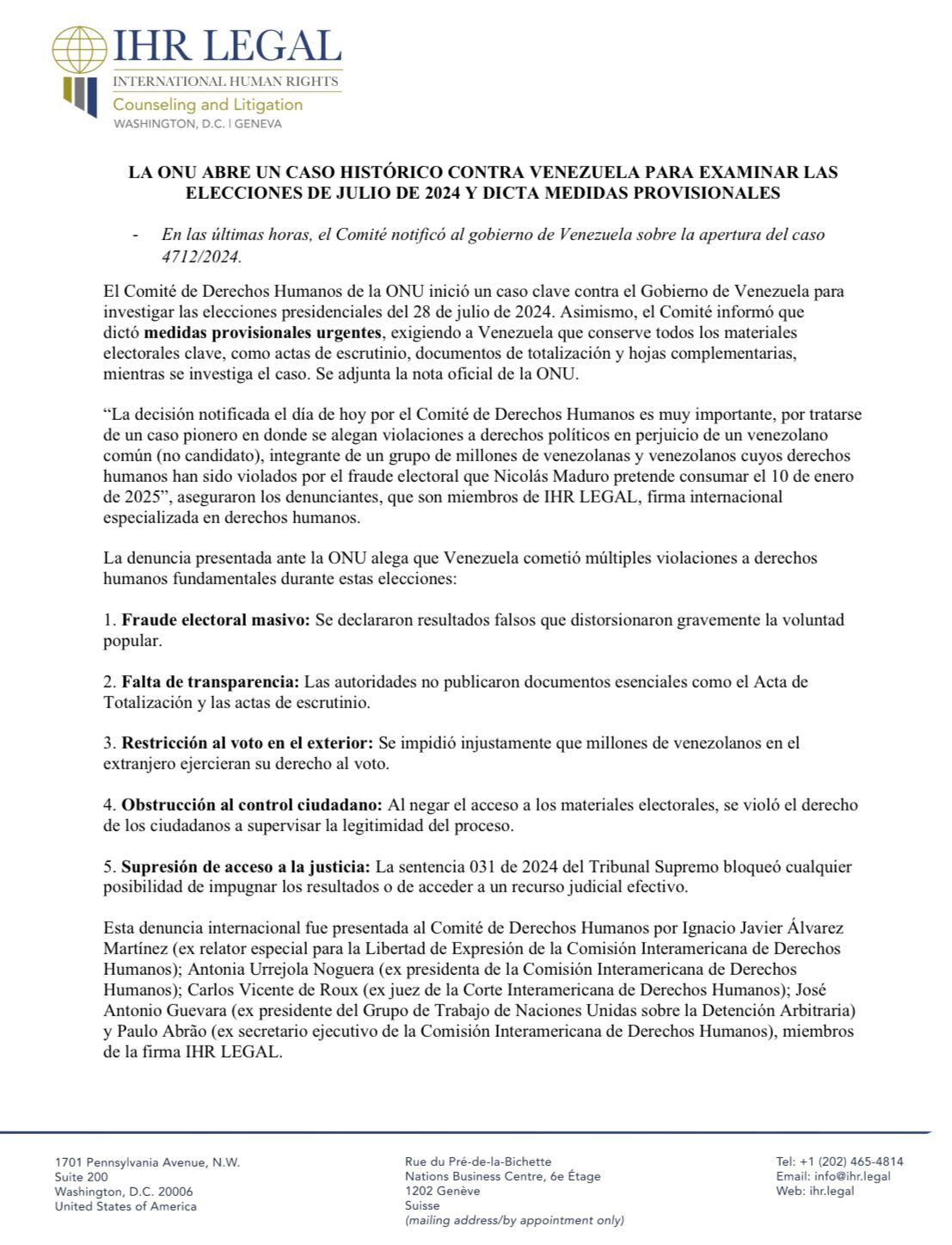 En su denuncia “se alegan violaciones a derechos políticos en perjuicio de un venezolano común (no candidato), integrante de un grupo de millones de venezolanas y venezolanos cuyos derechos humanos han sido violados por el fraude electoral que Nicolás Maduro pretende consumar el 10 de enero de 2025″, agregaron.