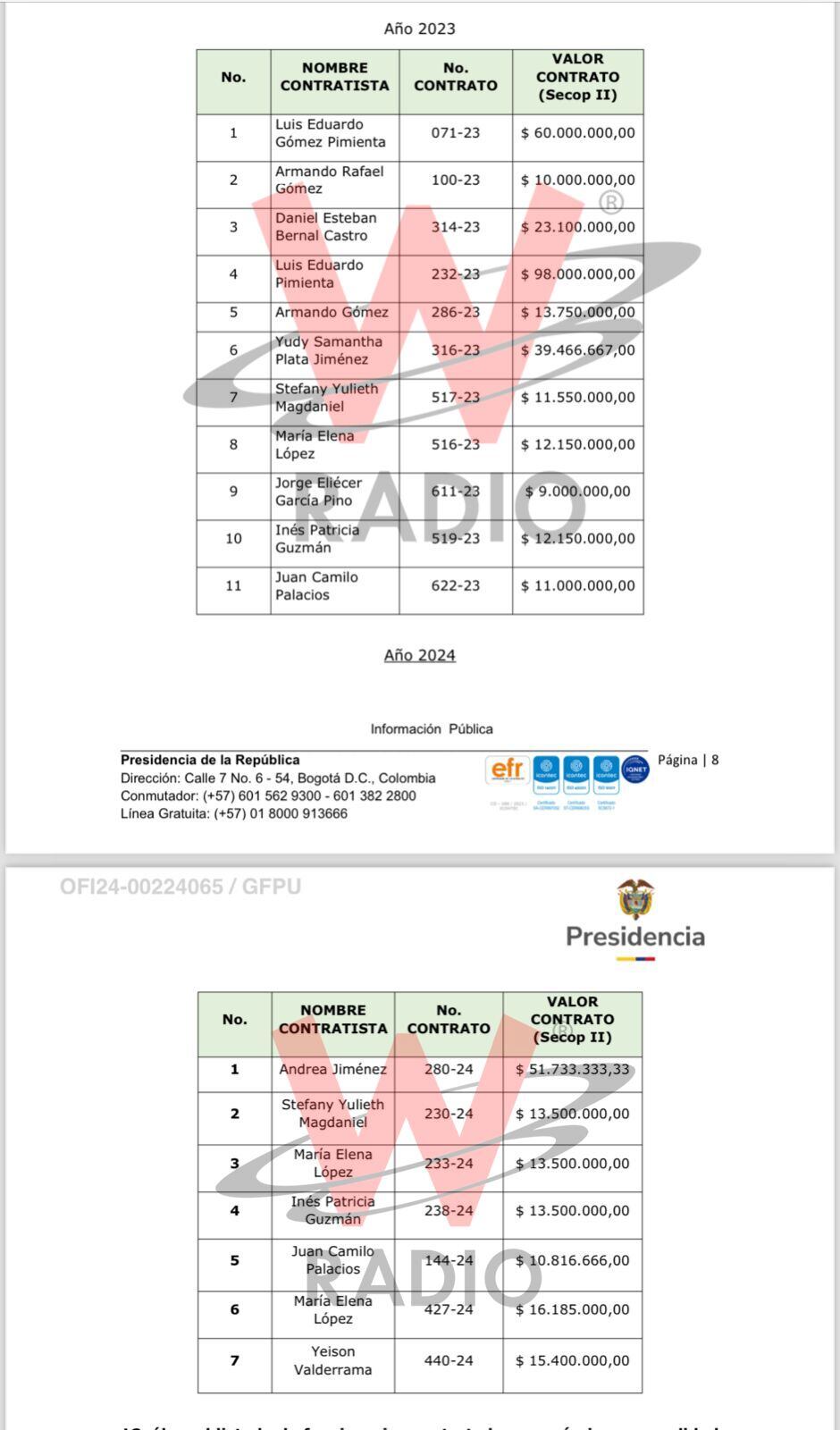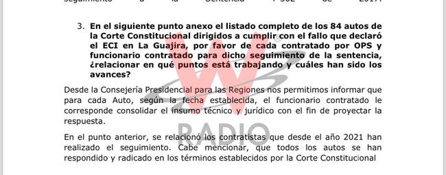 La W conoció contratos de hasta $100 millones, que reciben contratistas de la consejería para las regiones para darle “cumplimiento” a la sentencia T- 302. Pero hasta la fecha, la Corte no ha recibido el reporte de cumplimiento de los funcionarios a los 84 autos de seguimiento que tiene actualmente la sentencia. Recordemos que esta consejería cuenta con el pasado cuestionado bajo la dirección de Sandra Ortiz.