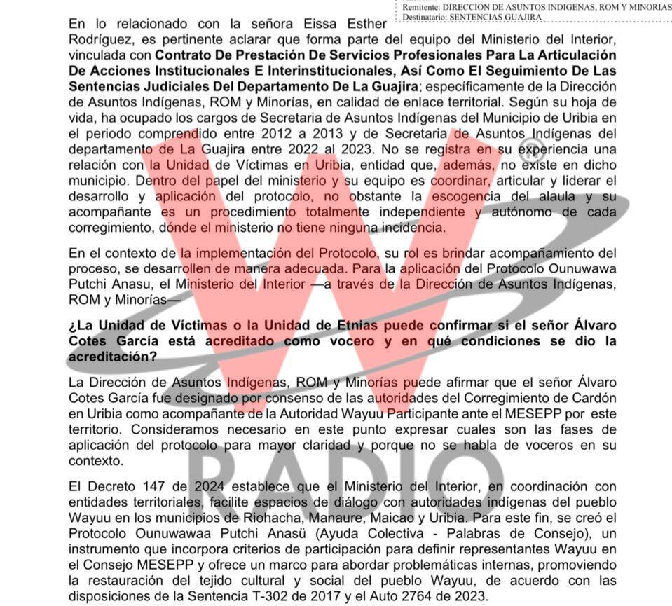Uno de los casos más relevantes es el de Eissa Rodríguez, exsecretaria de Asuntos Indígenas de La Guajira, quien actualmente ejerce como enlace del MESSEP, es decir, entre el Ministerio del Interior y el pueblo Wayúu.
