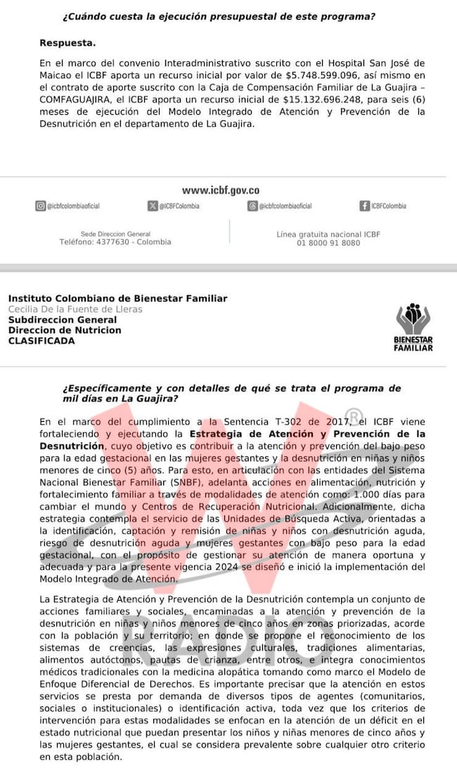 “En el marco del cumplimiento a la Sentencia T-302 de 2017, el ICBF viene fortaleciendo y ejecutando la Estrategia de Atención y Prevención de la Desnutrición, cuyo objetivo es contribuir a la atención y prevención del bajo peso para la edad gestacional en las mujeres gestantes y la desnutrición en niñas y niños menores de cinco (5) años. Para esto, en articulación con las entidades del Sistema Nacional Bienestar Familiar (SNBF), adelanta acciones en alimentación, nutrición y fortalecimiento familiar a través de modalidades de atención como: 1.000 días para cambiar el mundo y Centros de Recuperación Nutricional”, le respondió la entidad a La W.