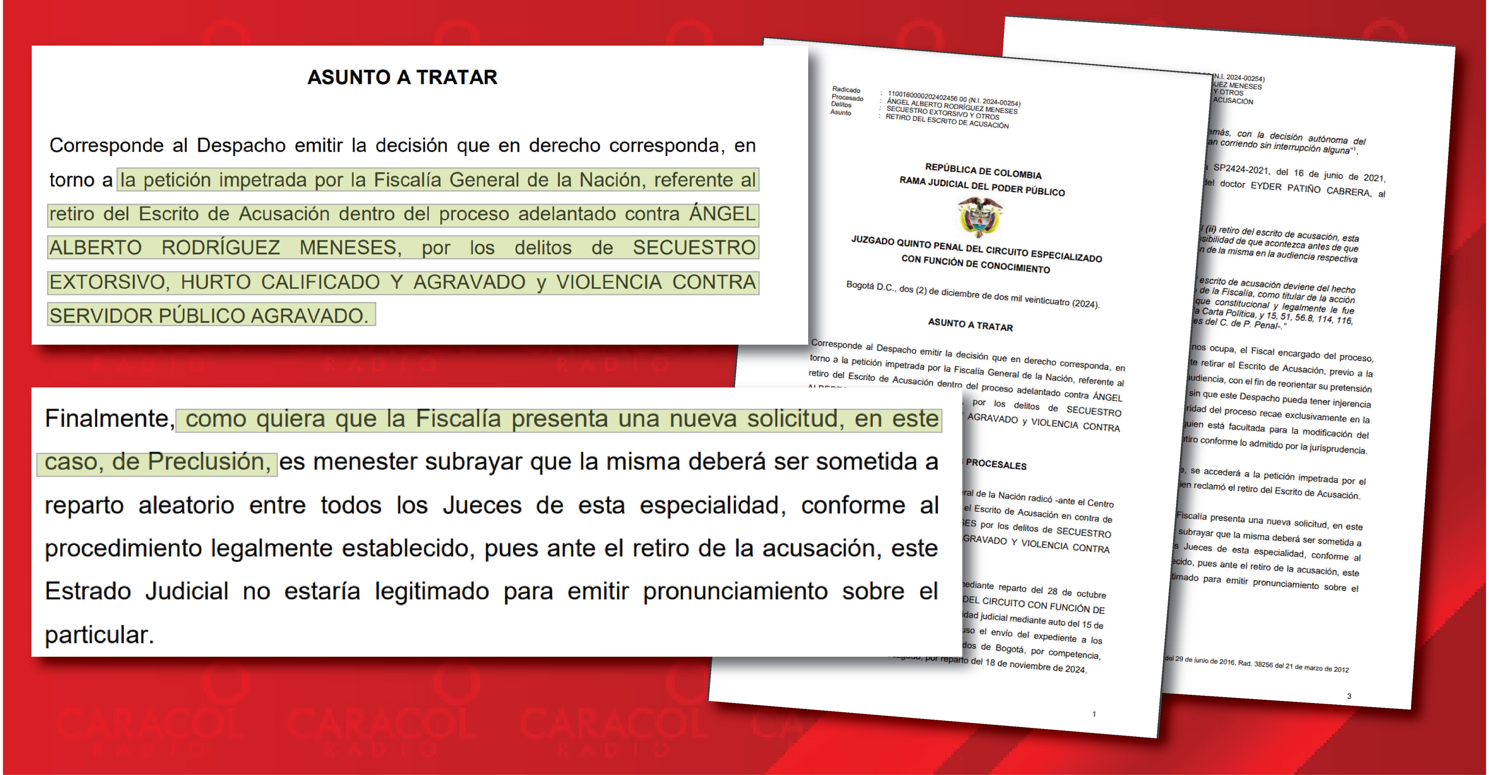 Caracol Radio conoció el auto del juez Quinto Penal Especializado de Bogotá donde consta que la Fiscalía retiró el escrito de acusación y en su lugar solicitó la preclusión del proceso en favor Ángel Alberto Rodríguez Meneses, a quien policías de la Metropolitana de Bogotá capturaron en la localidad de Ciudad Bolívar y acusaron falsamente de secuestro extorsivo, hurto agravado y violencia contra servidor público.