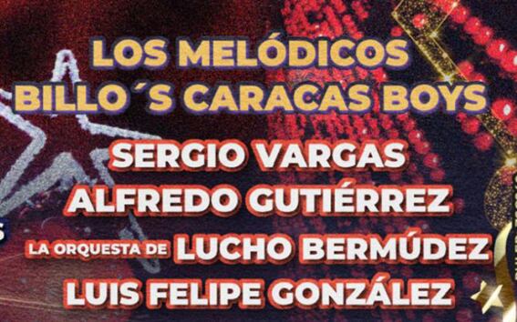 Estarán en vivo desde las 7 pm, la emblemática orquesta venezolana Billo’s Caracas Boys, Los Melódicos, La Orquesta de Lucho Bermúdez Luis Felipe González, Alfredo Gutiérrez y como invitado especial Sergio Vargas, todos juntos en un escenario 360 con tarima giratoria,