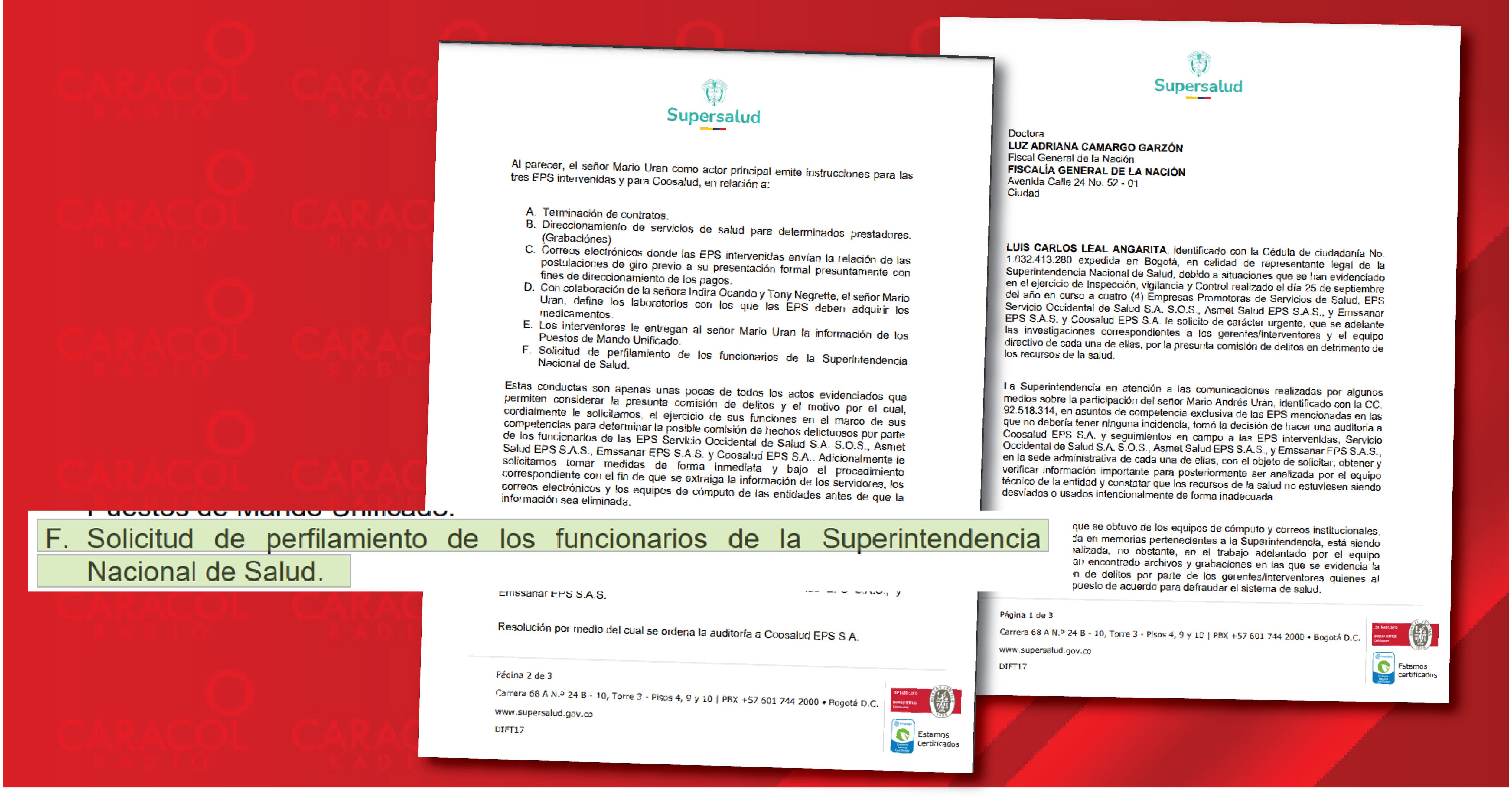 Caracol Radio revela un nuevo episodio del escándalo de los desvíos de los recursos de la salud y el exasesor de Coosalud Mario Urán que investigan la Fiscalía y la Procuraduría. En el computador de Urán fue hallado un documento que sería una especie de “instructivo” en el que pedía “perfilar a los funcionarios de la Supersalud”.((ver documento))