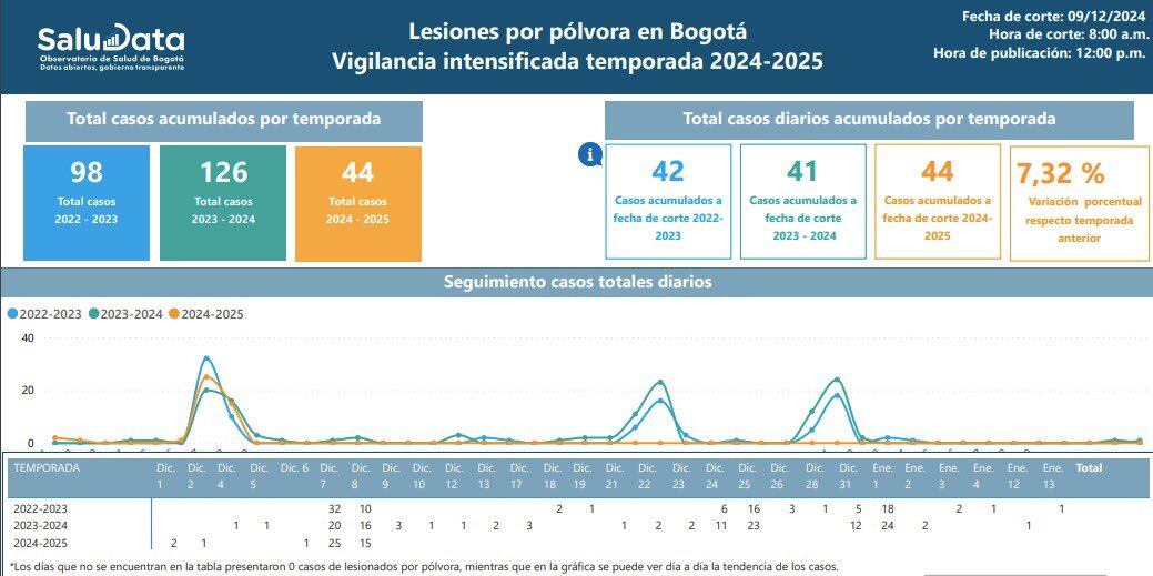 Según el más reciente balance emitido por el Observatorio de Salud de Bogotá (SaluData), ya son 44 los casos de quemados por pólvora en la capital. Cifra que aumentó significativamente del día ayer a horas de la mañana al día de hoy.
