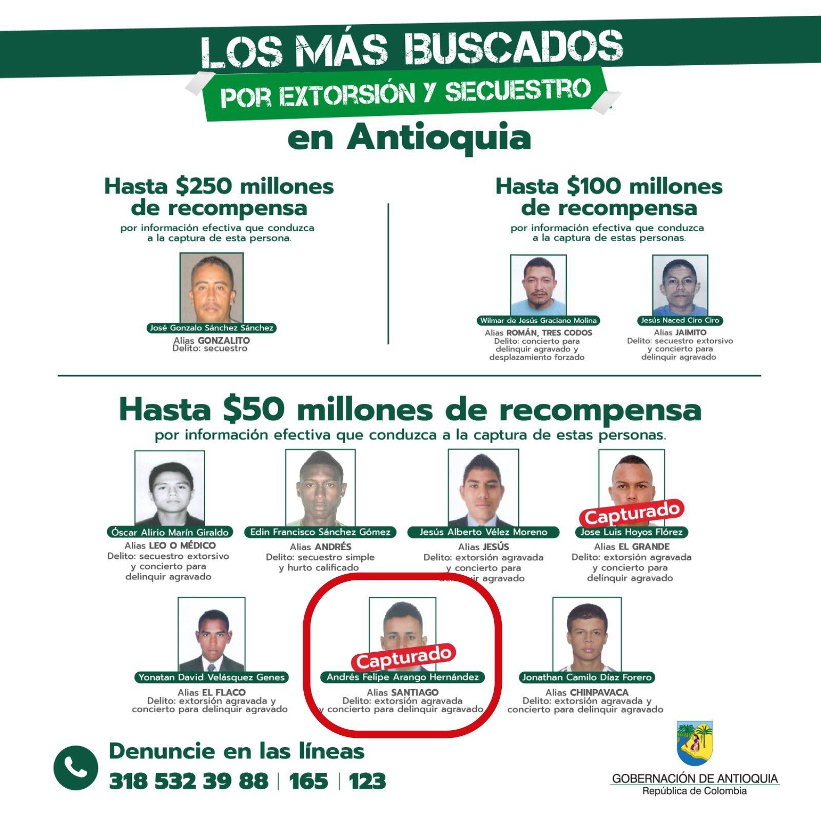 Andrés Felipe Arango Hernández, alias ‘Santiago’, es señalado como cabecilla de zona del componente criminal focalizado del Clan del Golfo, subestructura Julio César Vargas, y hacía parte del cartel de los más buscados por el delito de extorsión. Adicionalmente, se ofrecía una recompensa de 50 millones de pesos por información que permitiera capturarlo.