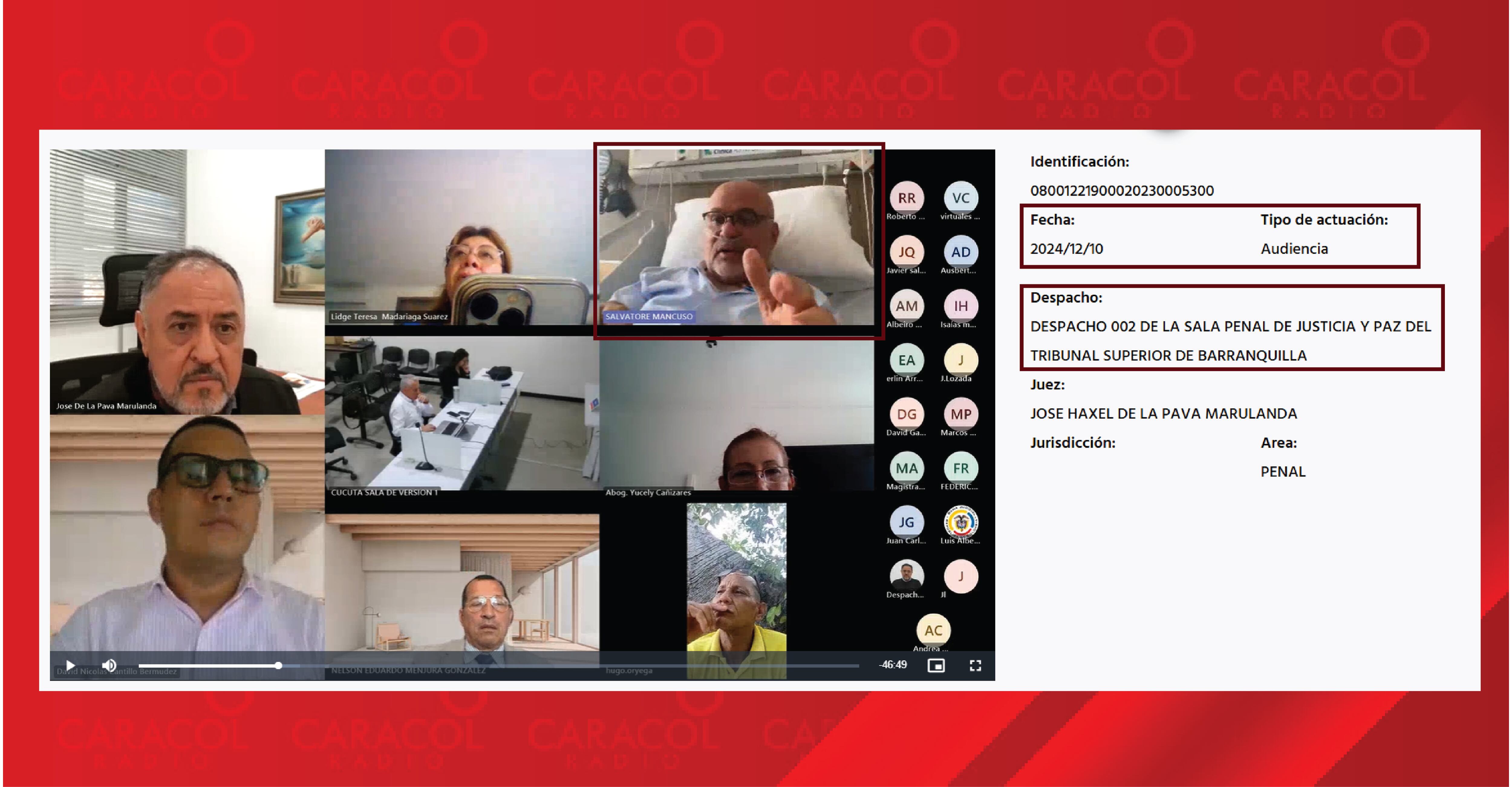 Mancuso visiblemente afectado por problemas de salud, acudió a la audiencia de manera virtual desde un hospital ante una Sala de Justicia y Paz por el caso de los bienes y los financiadores de las extintas AUC en la costa caribe.