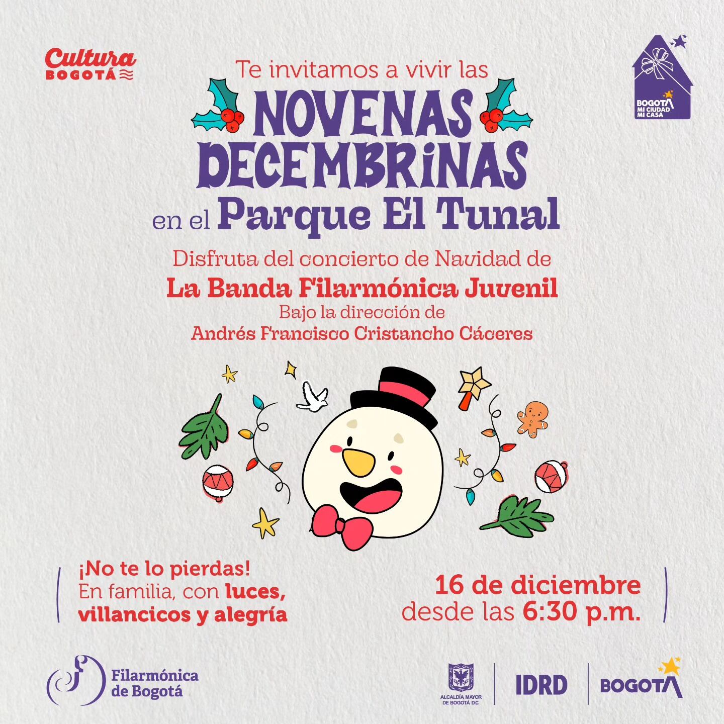 Además, la administración local anunció que, Bogotá ofrecerá una nutrida agenda cultural durante las festividades, con eventos gratuitos que destacan el talento local. Entre esos se destacan conciertos y encuentro para todas las edades en las novenas barriales que inician a partir de las 5 pm, este domingo 15 de diciembre en Altos del Virrey.