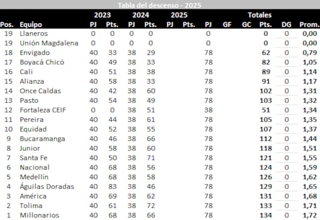 Vale la pena mencionar que los dos equipos que descienden (a menos que haya un cambio en el formato) son los que ocupen los últimos puestos en esta tabla. En el caso de Llaneros y Unión Magdalena, empiezan en esas casillas a construir de ceros sus respectivos promedios.
