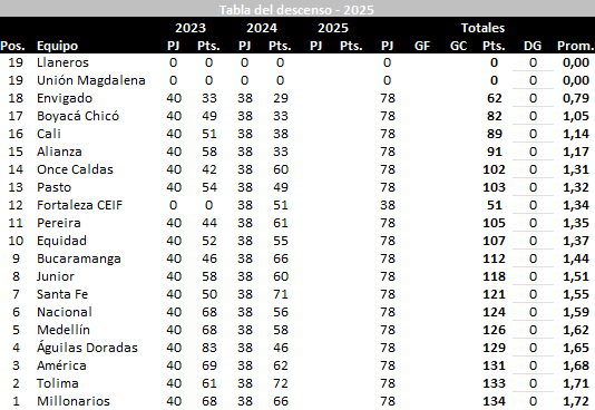 Vale la pena mencionar que los dos equipos que descienden (a menos que haya un cambio en el formato) son los que ocupen los últimos puestos en esta tabla. En el caso de Llaneros y Unión Magdalena, empiezan en esas casillas a construir de ceros sus respectivos promedios.
