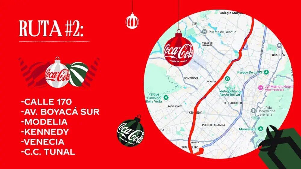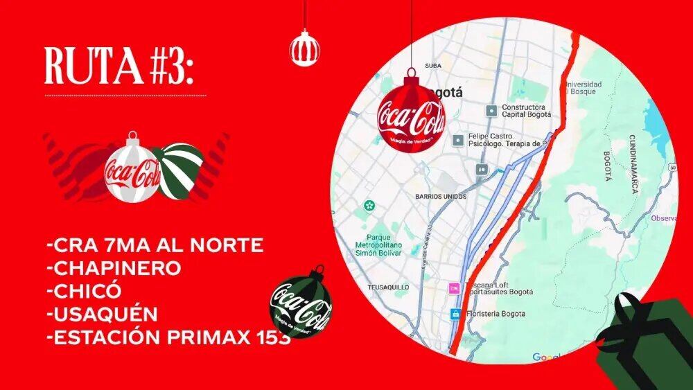 La empresa más reconocida en bebidas azucaradas, Coca-Cola, celebra la Navidad con actividades en distintas partes de Colombia. Aunque el recorrido comenzó el pasado sábado 14 de diciembre, las calles se iluminarán por dos días más, pues este lunes 16 y martes 17 de este mes, también se realizará el recorrido. La marca manifestó que más allá de llenar de luces, los lugares de la capital, también regalarán productos.