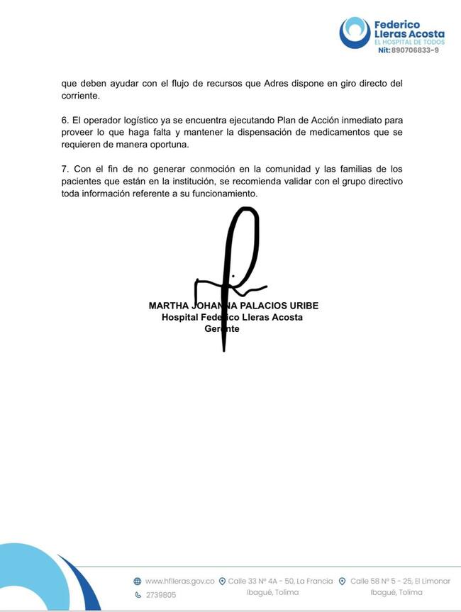 Imagen del comunicado del hospital Federico Lleras de Ibagué