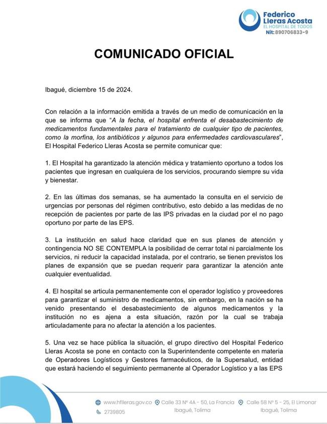 Por ese motivo desde el primer centro asistencial del Tolima se expidió un comunicado haciendo claridad a la opinión pública: