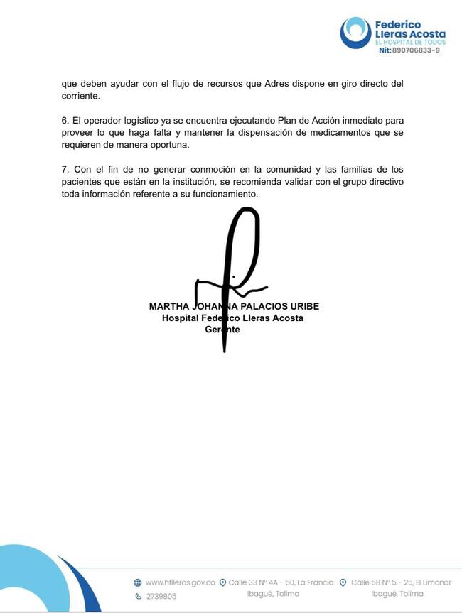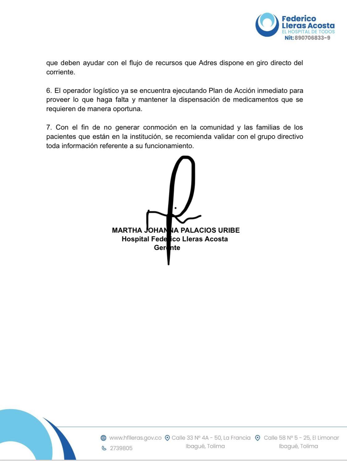 Imagen del comunicado del hospital Federico Lleras de Ibagué