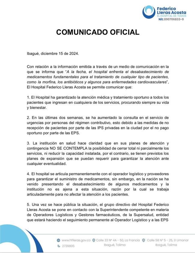 Por ese motivo desde el primer centro asistencial del Tolima se expidió un comunicado haciendo claridad a la opinión pública: