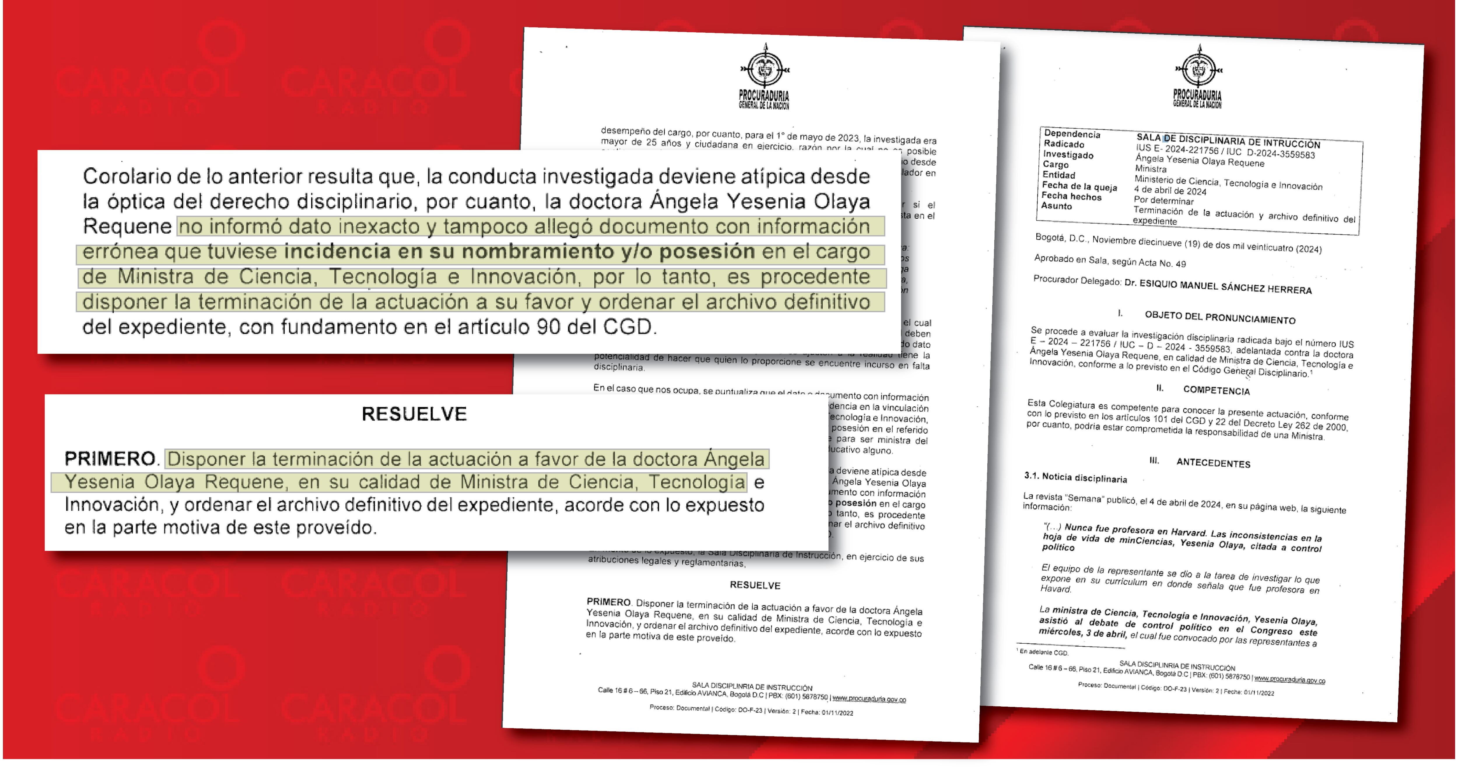 Al analizar el caso, el procurador delegado Esiquio Manuel Sánchez, determinó que la conducta por la que fue denunciada no se ajusta al derecho disciplinario, y la ministra Angela Yesenia Olaya, no presentó datos inexactos ni documentos erróneos para ser nombrada ministra de Ciencia, Tecnología e Innovación como en su momento lo denunció la congresista Jennifer Pedraza.