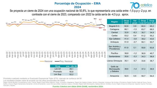 Asimismo, la Asociación Hotelera señaló que las proyecciones para el cierre del año, no son muy alentadoras, ‘’De acuerdo con las cifras del DANE, desde Cotelco proyecta que la ocupación nacional cierre en 50,8%, lo que significaría una caída entre -1,5 p.p. y -2 p.p. en comparación con el cierre de 2023.’'