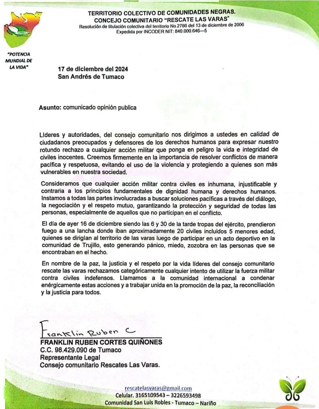 Directos del Consejo Comunitario las Varas asentado en zona rural de Tumaco pidió que se investigue los hechos registrados el pasado 16 de diciembre con una embarcación que se movilizaba entre Trujillo y San Luis del Roble, la cual fue objeto de disparos de manera indiscriminada supuestamente por militares que se encontraban en la zona.