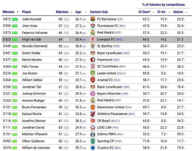 En el primer lugar del ranking se encuentra el francés Jules Koundé del FC Barcelona, quien acumuló un total de 5,872 minutos en 69 partidos, destacándose como el jugador de campo más utilizado del mundo. Lo acompañan en el podio el colombiano Jhon Arias, de Fluminense, con 5,599 minutos en 67 encuentros, y el uruguayo Federico Valverde, de Real Madrid, con 5,573 minutos en 66 partidos.