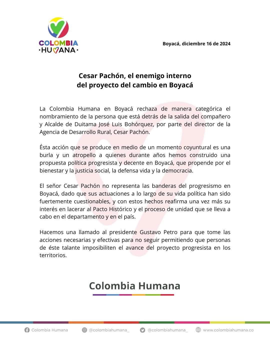 Por otro lado, Colombia Humana en Boyacá también rechazó el nombramiento, calificándolo como una burla al proyecto progresista en la región y solicitando al presidente Gustavo Petro que tome medidas para evitar que decisiones como esta, obstaculicen el avance del Pacto Histórico.