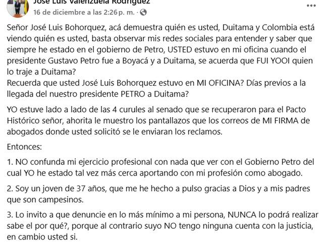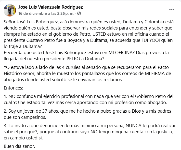Defendió su integridad y trayectoria profesional, destacando su cercanía con el gobierno del presidente Gustavo Petro y su contribución al Pacto Histórico. Valenzuela negó cualquier vínculo con actividades ilícitas y desafió al alcalde Bohórquez a presentar pruebas en su contra. Además le recordó que fue él quien solicitó su ayuda en el pasado y que su ejercicio profesional no debería ser confundido con su apoyo al gobierno de Petro.