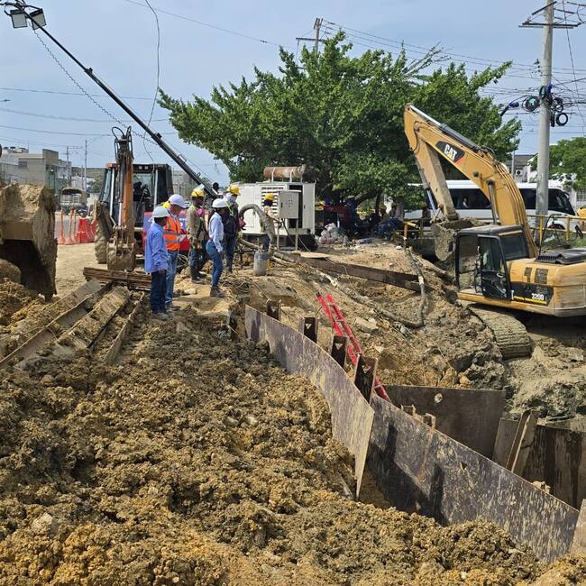 Aguas de Cartagena ha alcanzado un 70% de avance en los trabajos de reparación de la tubería CCP de 36 pulgadas, ubicada a más de 6 metros de profundidad en la transversal 54, a la altura del barrio Ceballos. Debido a la complejidad de la intervención, se han implementado medidas especiales de seguridad.