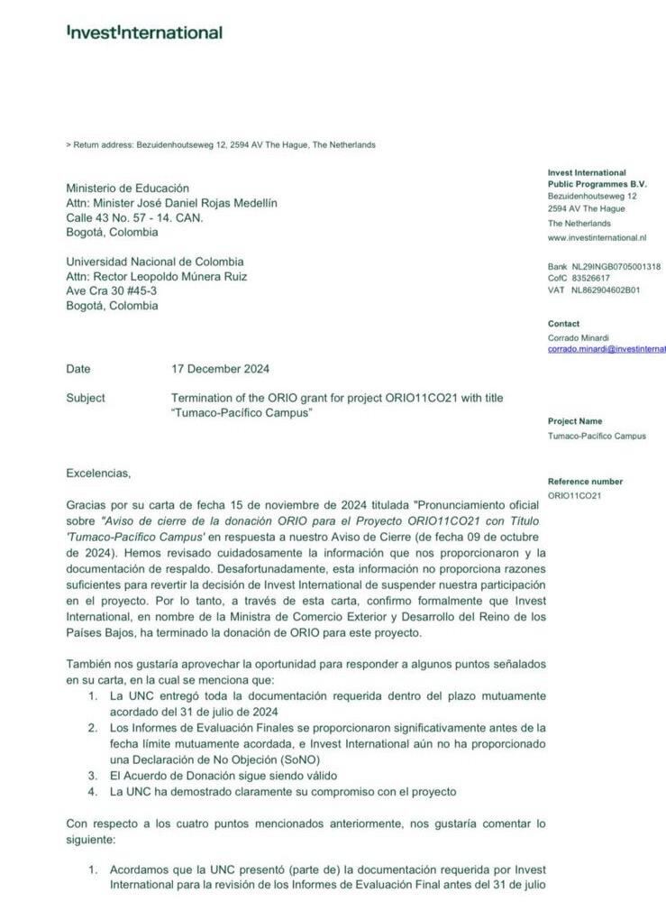 “Hemos revisado cuidadosamente la información que nos proporcionaron y la documentación de respaldo. Desafortunadamente, esta información no proporciona razones suficientes para revertir la decisión de Invest International de suspender nuestra participación en el proyecto”, dice el documento firmado por Bassel Younan, gerente de Asia y América de Invest International.