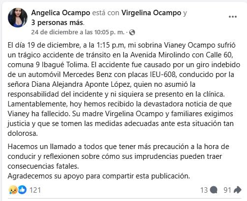 Falleció Vianey Ocampo, la persona que fue atropellada por un vehículo tipo Mercedes Benz en la calle 60 con avenida Mirolindo en la tarde del pasado 19 de diciembre.