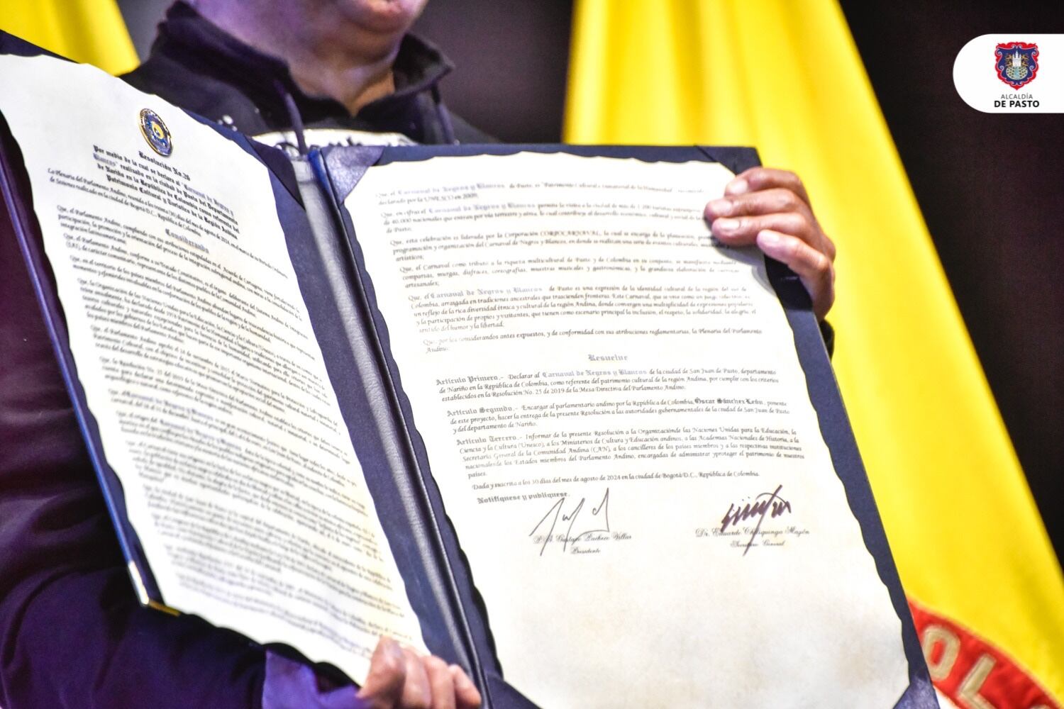 Parlamento Andino, entrega reconocimiento al Carnaval de Pasto. Foto: Alcaldía de Pasto