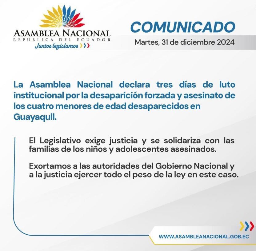 La Asamblea Nacional de Ecuador declaró tres días de luto institucional por las víctimas.