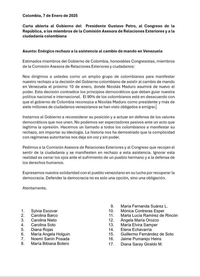 La carta titulada “Enérgico rechazo a la asistencia al cambio de mando en Venezuela”, los firmantes le piden al presidente Petro “reconsiderar” la idea de enviar a un delegado a la posesión de Nicolás Maduro el próximo 10 de enero, que según confirmó el vicecanciller Jorge Rojas, sería el embajador en ese país Milton Rengifo.