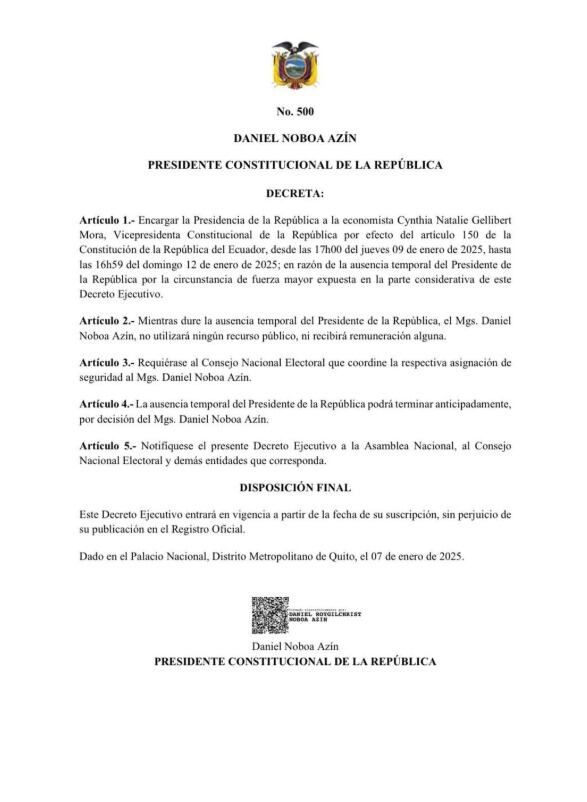 Gellibert estará a cargo de la Presidencia a partir del jueves 9 de enero hasta el domingo 12 de enero de 2025 debido a circunstancias de fuerza mayor por parte de Noboa, según el articulo 1 del Decreto.