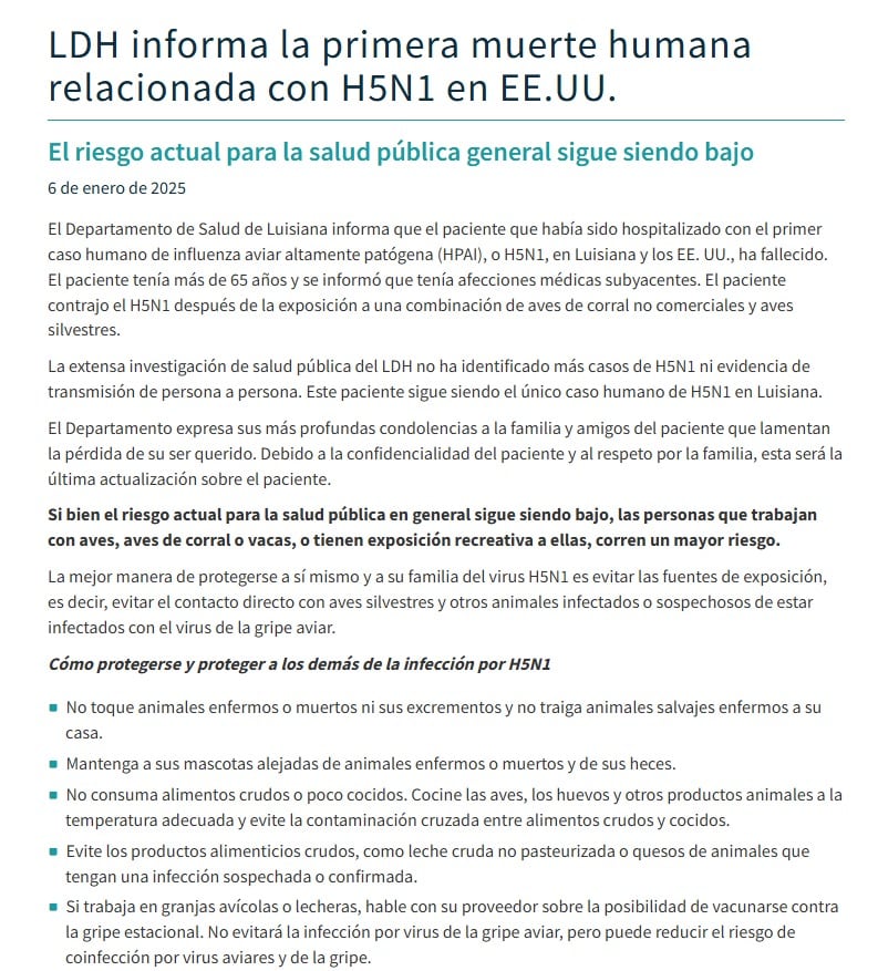 LDH reports first U.S. H5N1-related human death. Current general public health risk remains low. January 06, 2025
