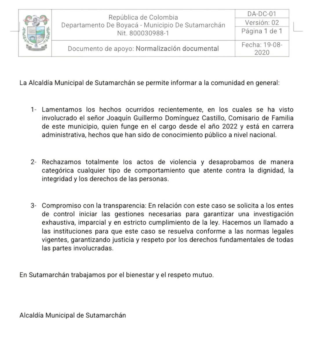 A raíz de lo ocurrido en la vía del departamento del Quindío, en el que se ve a Joaquín Guillermo Domínguez agrediendo físicamente a un conductor que le habría chocado su vehículo, desde la alcaldía del municipio de Sutamarchán se emitió un comunicado rechazando estos actos de violencia del servidor público.