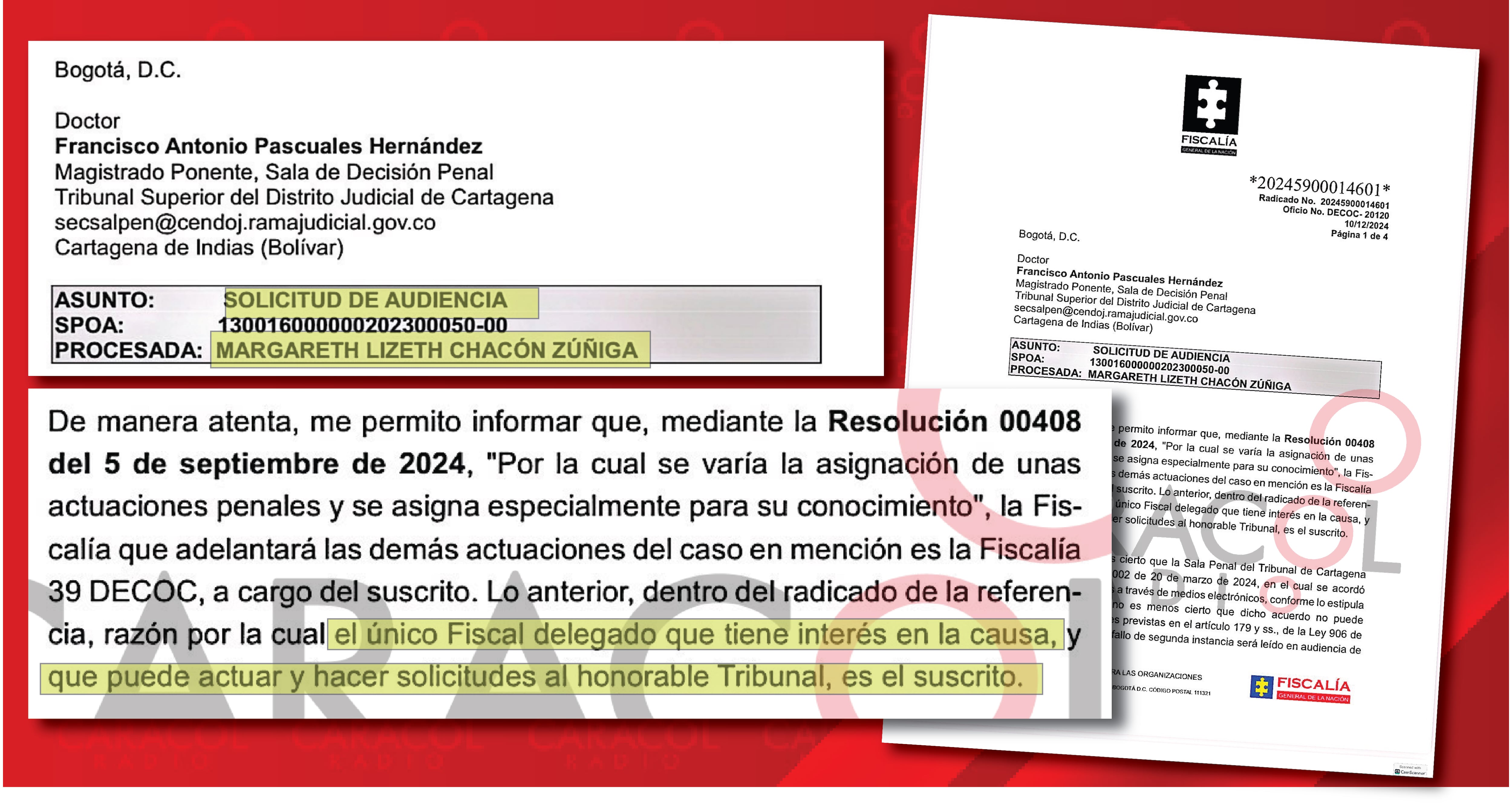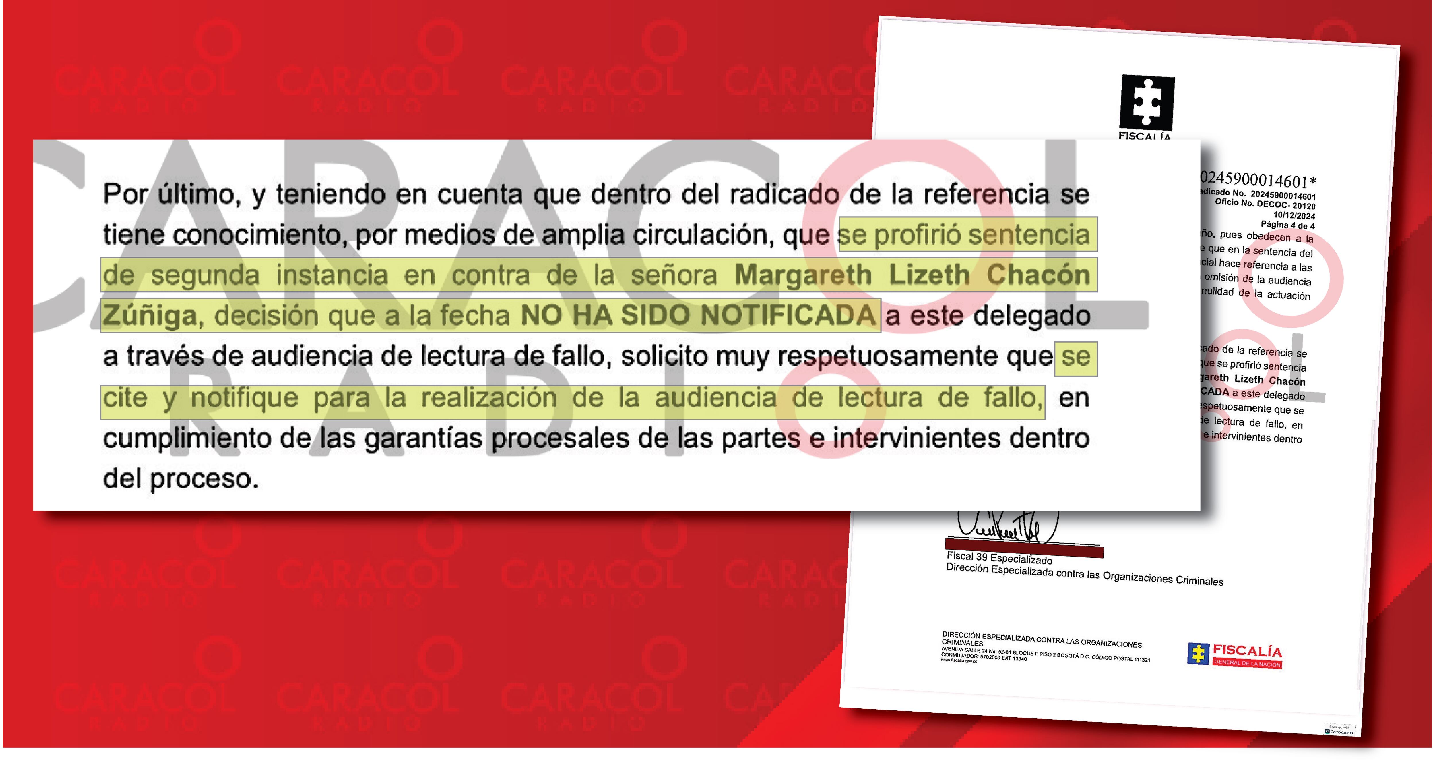 Caracol Radio conoció un oficio de cuatro páginas donde el nuevo fiscal del caso Pecci le reclamó al Tribunal Superior de Cartagena, primero, porque no se hizo la audiencia de lectura de fallo para notificar en debida forma la sentencia contra Margareth Chacón como lo ordena la ley. (ley 906 de 2004) (VER DOCUMENTO 1)