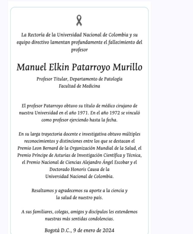 La Universidad Nacional se pronunció sobre el fallecimiento del investigador colombiano. Consulte todos los detalles del doctor Patarroyo, quien falleció a sus 78 años.