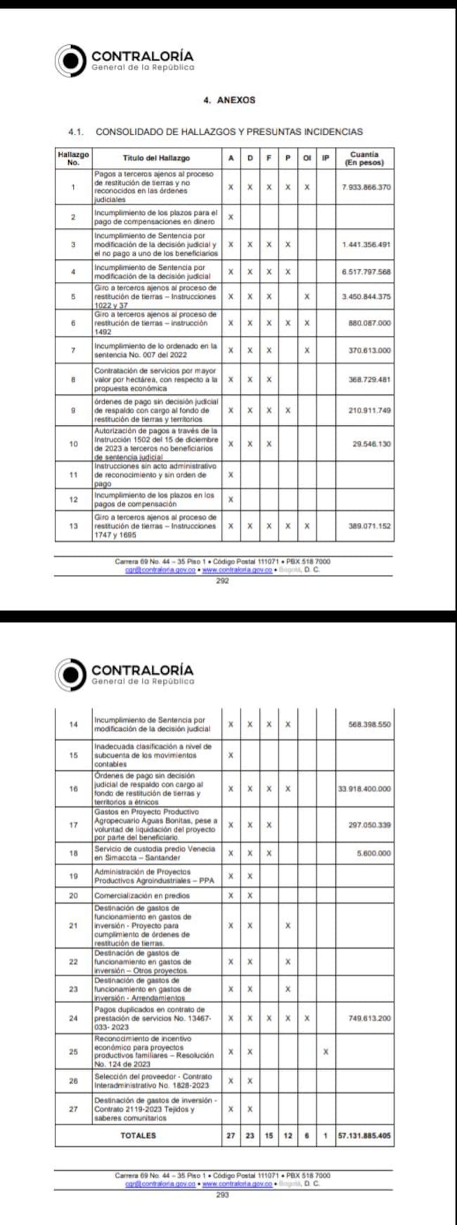 - También señala la Contraloría que otros $7.000 millones de pesos fueron pagados en contravía de las decisiones judiciales. Aunque las órdenes judiciales establecían que se debía entregar tierra, se giraron recursos en efectivo. En algunos casos a personas que no eran las beneficiarias de las determinaciones judiciales.