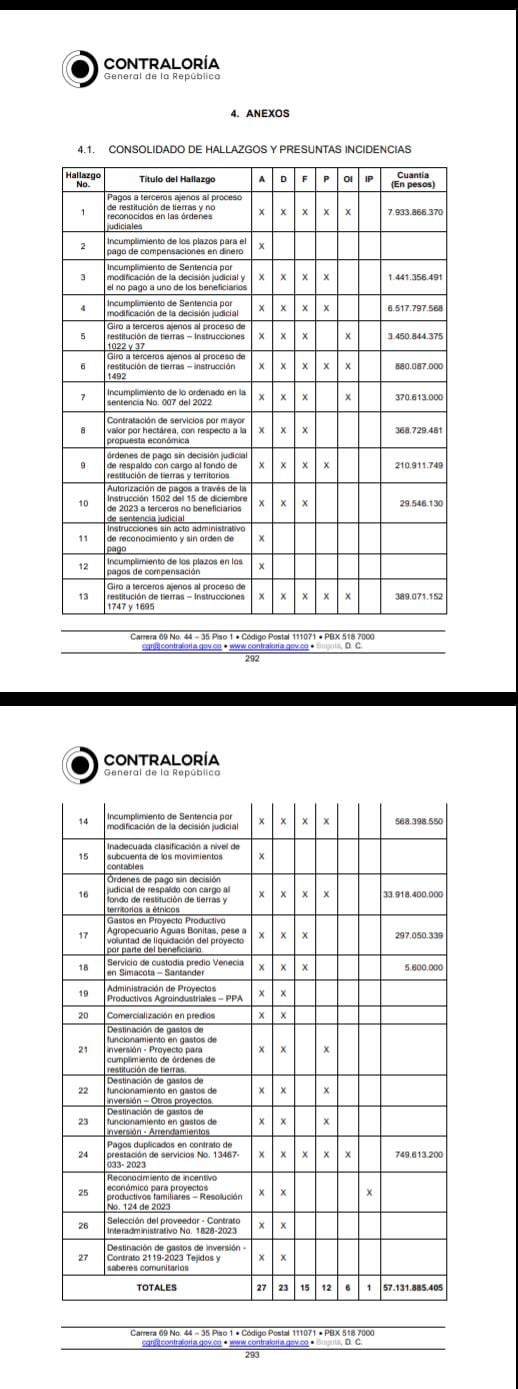 - También señala la Contraloría que otros $7.000 millones de pesos fueron pagados en contravía de las decisiones judiciales. Aunque las órdenes judiciales establecían que se debía entregar tierra, se giraron recursos en efectivo. En algunos casos a personas que no eran las beneficiarias de las determinaciones judiciales.