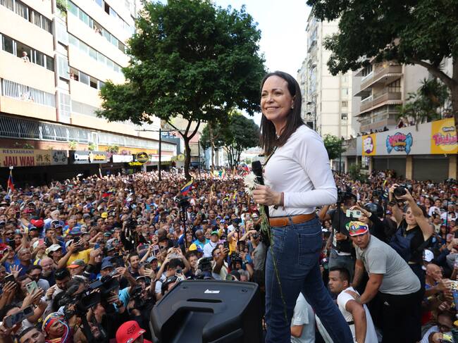 AME9799. CARACAS (VENEZUELA), 09/01/2025.- La líder antichavista María Corina Machado pronuncia un discurso este jueves, en una manifestación en Caracas (Venezuela). Machado expresó, cuando salió de la clandestinidad para participar en una protesta en Caracas, que Venezuela "superó el miedo" al estar en las calles para -aseguró- defender el reclamado triunfo de Edmundo González Urrutia en las elecciones del pasado julio, en las que Nicolás Maduro fue proclamado ganador por el organismo comicial. EFE/ Miguel Gutiérrez / MIGUEL GUTIERREZ (EFE)