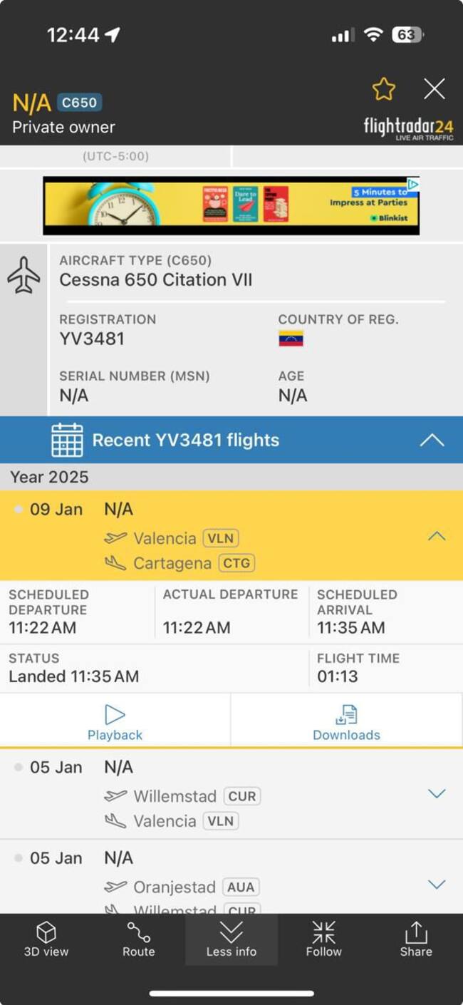 Sin embargo, La W conoció que un segundo avión de origen venezolano, de matrícula YV3481, habría aterrizado en el aeropuerto de Cartagena Rafael Núñez el pasado 9 de enero alrededor de las 11:30 de la mañana.
