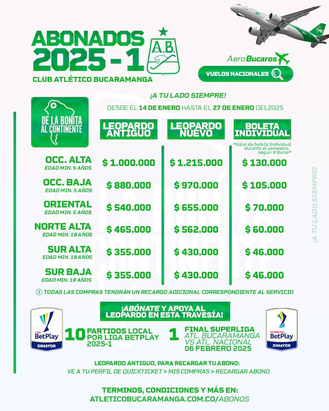 Quienes adquieran los abonos, podrán disfrutar de 10 partidos de local por Liga BetPlay 2025-I y 1 partido de final de la Superliga: Atlético Bucaramanga Vs Atlético Nacional, el 6 de febrero.