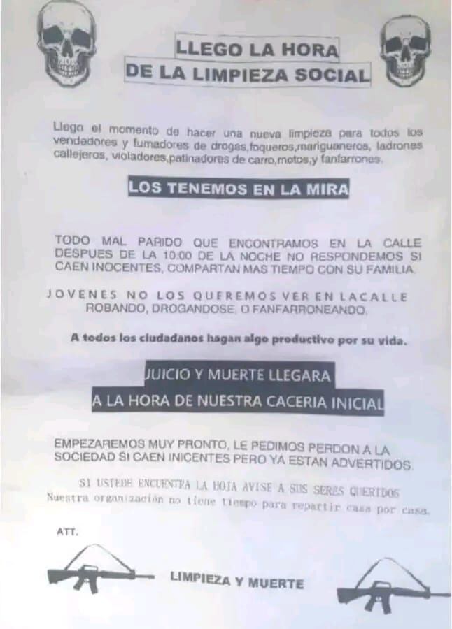 Lo que ha causado mucho temor entre los moradores de estos barrios es que en los panfletos advierten que si encuentran personas en las calles a partir de las 10:00 de la noche, pueden ser víctimas de este supuesto grupo que se hacen llamar ‘Limpieza y muerte’.