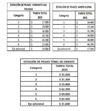 En el caso del peaje ubicado en la variante Las Palmas que tenía un valor en el 2024 de 15.500 para la categoría 1, el valor para el año 2025 será 17.800 pesos, es decir, 2.300 pesos de más.
