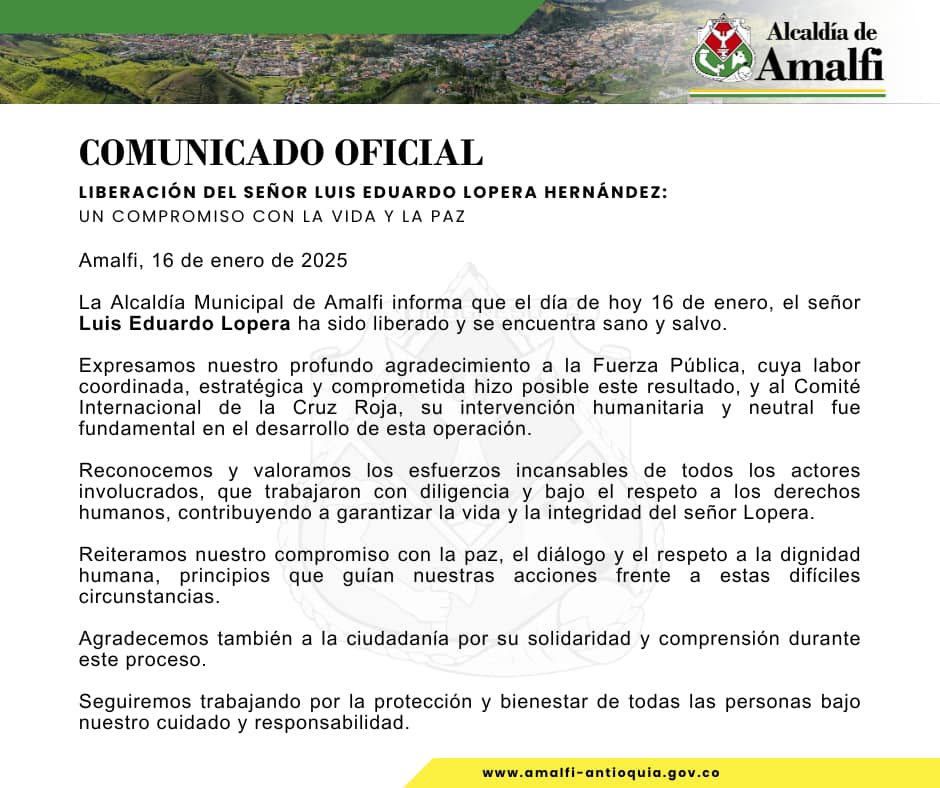La alcaldía de la población donde ocurrió el secuestro, mediante un comunicado, agradeció a la fuerza pública y manifestó que de manera coordinada permitió ese resultado, además del CICR que, por la intervención humanitaria, “reconocemos y valoramos los esfuerzos incansables de todos los actores involucrados que trabajaron con diligencia y bajo el respeto de los derechos humanos, contribuyendo a garantizar la vida del señor Lopera”.